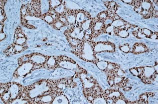 Рис. 4. Высокая экспрессия рецепторов андрогенов в ядрах опухолевых клеток больных люминального подтипа A. Увеличение ×20