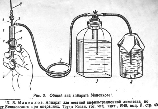 - Маненков П.В. Аппарат для местной инфильтрационной анестезии по методу Вишневского при операциях. Труды КГМИ. 1948;(2):50–55.