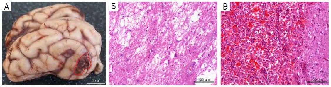 Conclusion. The developed two-level method of stroke modeling in a mini pig induces ischemic cerebral infarction of limited volume in the parietal lobe; non-critical histological changes in the peri-infarct area and a slight neurological deficit suggest the possibility of using this model to develop new methods of stroke therapy.