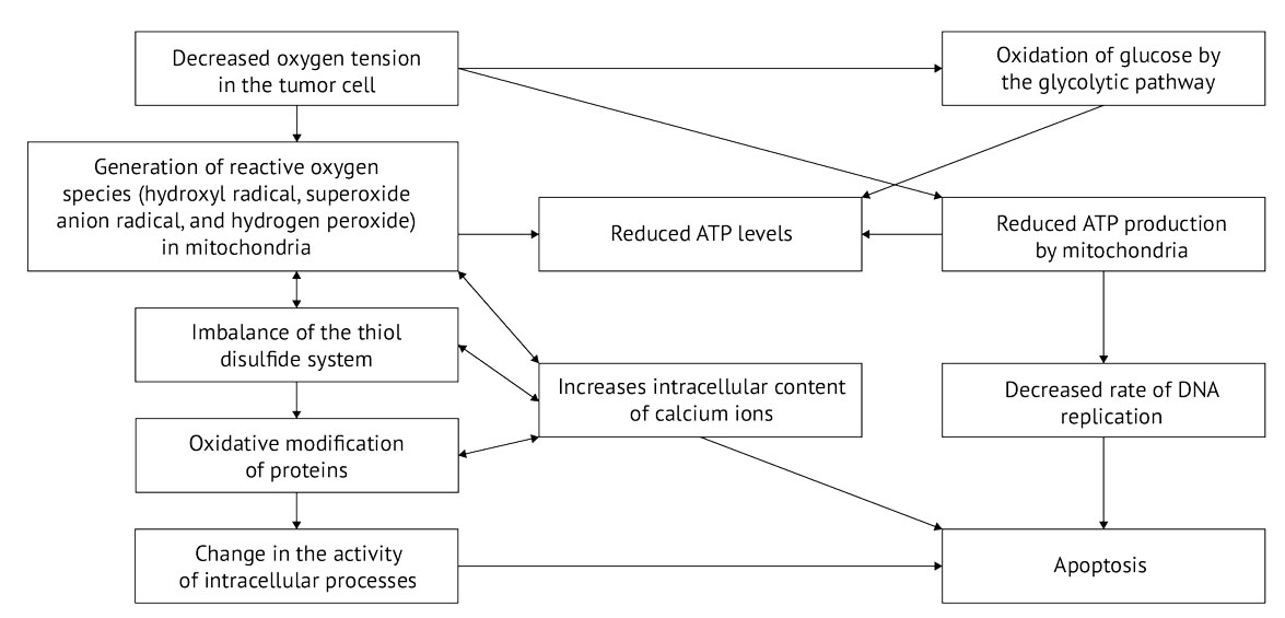 Hypoxia and oxidative stress underlie the development of pathological processes, including tumor growth [14–16]. To date, in response to an insufficient oxygen supply to cells and the activation of free radical oxidation, apoptosis, and other types of cell death (e.g., ferroptosis, necrosis, and autophagy) can be triggered [17]. Low oxygen tension contributes to the disruption of apoptosis of tumor cells and the appearance of additional resistance to therapeutic effects [18]. The molecular mechanism underlying these changes is the activation of transcription of genes encoding information about proteins, including glycolysis enzymes and transcription factors, namely, hypoxia-inducible factors (HIFs), nuclear factor-κB, Apaf-1, and others [11, 19, 20].