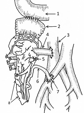 Рис. 1. Схема трансплантации поджелудочной железы с изолированным кровоснабжением по селезёночной артерии: 1 — duodenum реципиента; 2 — культя duodenum донора; 3 — v. cava inferior; 4 — v. porta; 5 — лигированная a. mesenterica superior; 6 — a. lianalis; 7 — a. iliaca communis; 8 — трансплантат поджелудочной железы