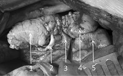 Рис. 2. Интраоперационная фотография трансплантата поджелудочной железы с изолированным кровоснабжением по селезёночной артерии: 1 — трансплантат поджелудочной железы; 2 — a. lienalis; 3 — v. porta; 4 — культя duodenum донора; 5 — duodenum реципиента