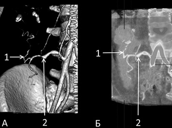 Рис. 3. (А) Трёхмерная реконструкция при компьютерной томографии (КТ) и (Б) КТ-перфузия трансплантата поджелудочной железы с изолированным кровоснабжением по селезёночной артерии: 1 — внутриорганные артериальные коллатерали; 2 — a. lienalis
