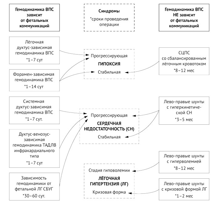 Указаны оптимальные сроки лечения, которые перепроверены собственным опытом. Следует отметить, что дуктус-зависимость была уже в обиходе у кардиохирургов и кардиологов, всё остальное нам пришлось дорабатывать. Средний столбец содержит перечень синдромов, через которые манифестируют ВПС, их всего три. Правый столбец содержит группы пороков, которые требуют отсроченного и планового лечения. Причём основной синдром и показание к хирургическому лечению «справа» — лёгочная гипертензия и её различные формы.
