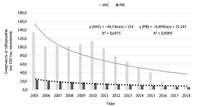 Рис. 1. Динамика показателя смертности от туберкулёза в учреждениях уголовно-исполнительной системы (УИС) в сравнении с общероссийским (РФ) за 2005–2018 гг.