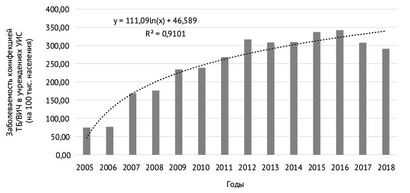 Как следует из рис. 2, за период с 2005 по 2018 гг. заболеваемость ТБ/ВИЧ-коинфекцией в пенитенциарных учреждениях увеличилась в 3,9 раза, составив в 2018 г. 290,9 на 100 тыс. человек. При этом отмечена заметная связь с восходящей линией тренда [R2(УИС)=0,91], что прогнозирует дальнейший рост показателя.