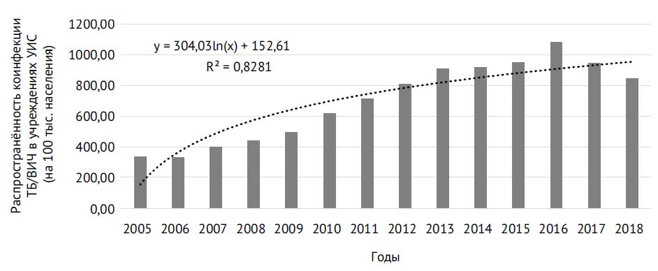 За исследуемый период заболеваемость ТБ/ВИЧ-коинфекцией в пенитенциарных учреждениях увеличилась в 3,9 раза, распространённость — более чем в 2,5 раза. Доля ВИЧ-инфицированных среди лиц, взятых на диспансерный учёт с активным ТБ, увеличилась почти в 10 раз, и в настоящее время более чем каждый третий впервые выявленный пациент с ТБ инфицирован ВИЧ. В связи с этим, несмотря на предпринимаемые мероприятия по борьбе с распространением ТБ/ВИЧ-коинфекции, в пенитенциарных учреждениях прогнозируется ухудшение эпидемической обстановки.