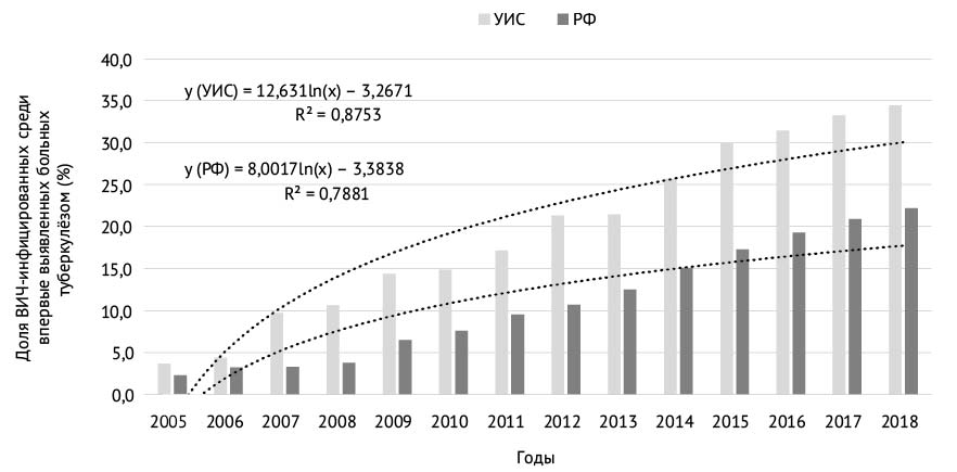 На рис. 4 видно, что за исследуемый период и в учреждениях УИС, и в организациях Минздрава отмечено практически 10-кратное увеличение доли ВИЧ-инфицированных среди пациентов, взятых на диспансерный учёт по ТБ (в 9,35 раза в УИС и в 9,65 раза в РФ). В 2018 г. более чем каждый третий (34,4%) среди пациентов пенитенциарных учреждений и более чем каждый пятый (22,2%) в РФ пациент, взятый на диспансерный учёт с активным ТБ, был инфицирован ВИЧ. Высокая связь с восходящими линиями тренда в УИС [R2(УИС)=0,88] и в РФ [R2(РФ)=0,79] позволяет сделать прогноз о дальнейшем росте доли ВИЧ-инфицированных в структуре первичной заболеваемости ТБ.