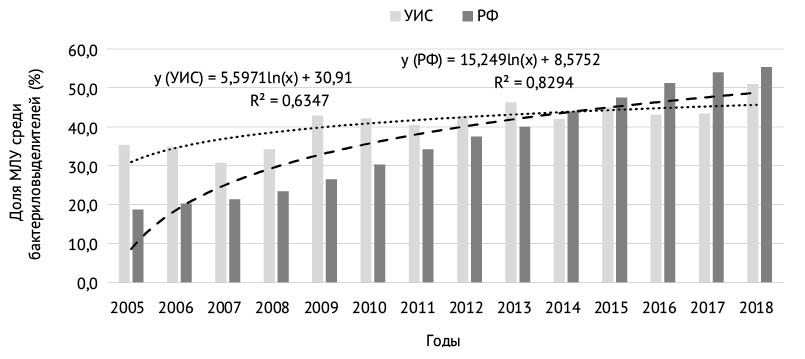 Рис. 5. Динамика показателя доли больных туберкулёзом с множественной лекарственной устойчивостью (МЛУ) среди выделителей микобактерии туберкулёза в учреждениях уголовно-исполнительной системы (УИС) в сравнении с общероссийским (РФ) за 2005–2018 гг.