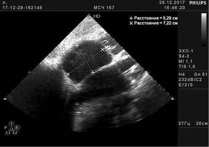 Рис. 1. Данные эхокардиографии: атриализированная часть правого желудочка, уменьшение его размеров, расширение фиброзного кольца трёхстворчатого клапана