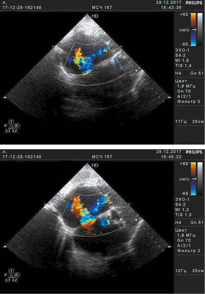 Рис. 2. Данные эхокардиографии в режиме цветового допплеровского картирования: сброс крови слева направо