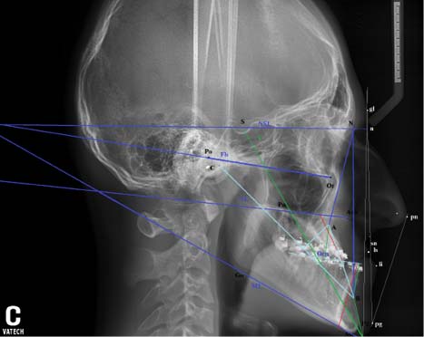 Учитывая, что положение передней точки подбородка (Pg) зависит от его размеров, по методу Sassouni было определено расстояние от Pg до перпендикуляра из точки В к нижнечелюстной плоскости. Величина подбородочного выступа оказалась 7,0 мм — в пределах нормы (6–9 мм).