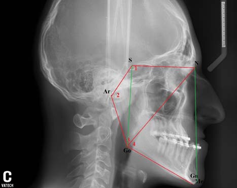 ∠NSAr ∠SArGo ∠NGoAr ∠NGoMe SGo/NGn | 118,8° (норма) 138,8° (норма) 52,8° (норма) 79,8° (–4,8°) 63,7% (–1,4%), тип роста вертикальный | 118,8° (норма) 138,8° (норма) 52,8° (норма) 79,8° (–4,8°) 63,7% (–1,4%), тип роста вертикальный | ∠NSAr=123,0±5,0° ∠SArGo=143,0±6,0° ∠NGoAr=52,0–55,0° ∠NGoMe=70,0–75,0° SGo/NGn=60% (±2%) (Jarabak) |