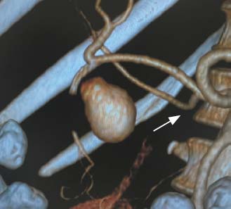 Рис. 1. Компьютерная ангиограмма брюшного отдела аорты. Стрелкой указана ложная аневризма желудочно-двенадцатиперстной артерии