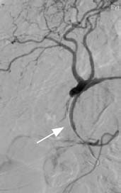 Рис. 2. Ангиограмма брюшного отдела аорты. Стрелкой указана ложная аневризма желудочно-двенадцатиперстной артерии
