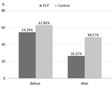 Fig. 1 presents the results of a statistical analysis of nitroglycerin intake by patients for the periods before treatment and after treatment for the ECP group and the control group. In a comparative analysis for the period before treatment, there was no statistically significant difference in the use of nitroglycerin between both groups (54.4 and 62.9%, respectively; p = .4247). However, in the period after treatment, the difference was significant; patients in the ECP group were less likely to use nitroglycerin than those in the control group (26.3% and 48.6%, respectively; p = .0296).