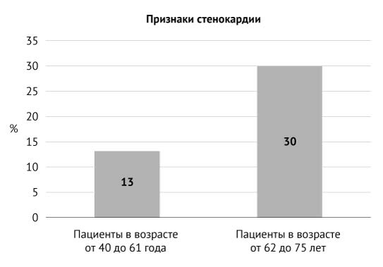 Рис. 4. Процентное соотношение выявленных признаков стенокардии по опроснику Роуза в разных возрастных группах