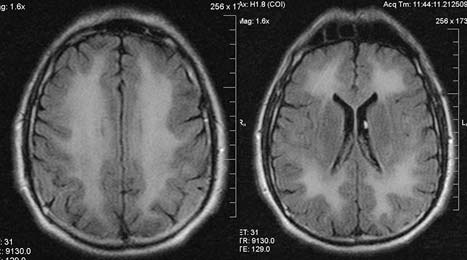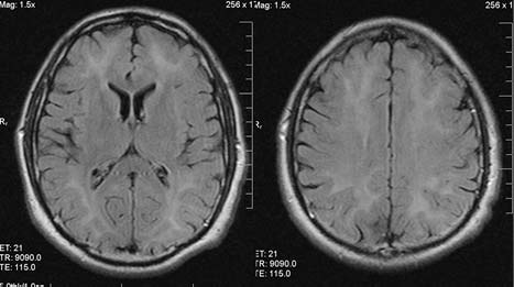 Повторное МРТ-исследование головного мозга (рис. 2): «На Т2-изображениях видно гиперинтенсивное перивентрикулярное белое вещество с поражением лобных и затылочных долей».
