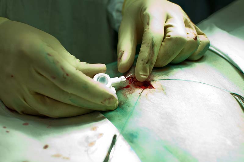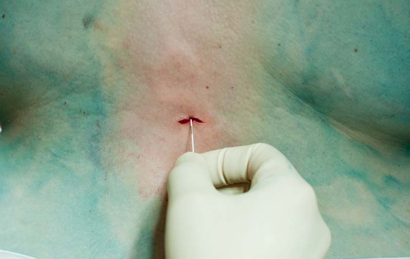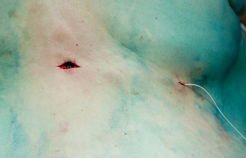 Рис. 3. В ране фрагмент уже подшитого фиксатора, часть катетера проходит в подкожной жировой клетчатке