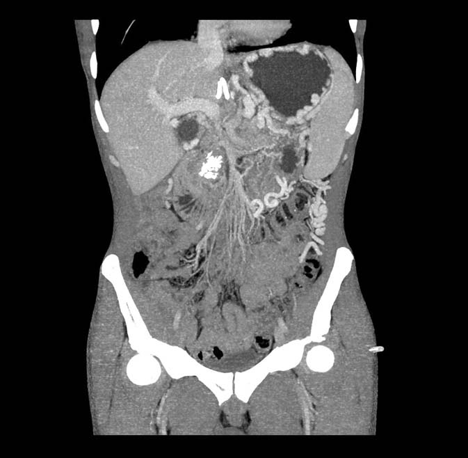 Мультиспиральная компьютерная томография органов брюшной полости и забрюшинного пространства: «Псевдотуморозный калькулёзный хронический панкреатит. Постнекротические псевдокисты головки поджелудочной железы. Забрюшинно-панкреатический трубчатый свищ. Признаки флеботромбоза верхней брыжеечной и селезёночной вен, признаки портальной гипертензии, многочисленные портокавальные анастомозы» (рис. 1, 2).