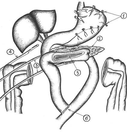 Рис. 3. Схема операции: 1 — варикозно расширенные вены желудка; 2 — поджелудочная железа; 3 — дренажи к панкреатоеюноанастомозу; 4 — дренаж в подпечёночное пространство; 5 — панкреатоеюноанастомоз; 6 — межкишечный анастомоз (Roux-en-Y)