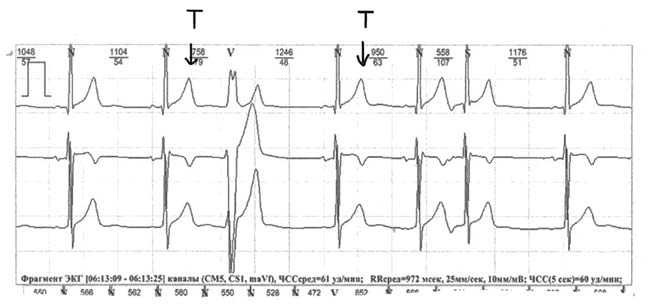 Полная компенсаторная пауза (точнее, тот дополнительный объём крови, который поступил в левый желудочек во время этой паузы), которая свойственна именно желудочковой экстрасистоле, и была тем триггером, той «последней каплей», которая реализовалась в субэндокардиальную ишемию миокарда и далее в гигантский положительный зубец Т.