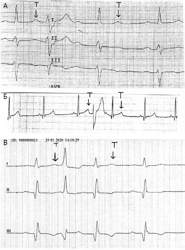 Зубцы Т не меняются и при вставочных (интерполированных) экстрасистолах со скрытым ретроградным проведением (или рефрактерностью атриовентрикулярного соединения) (рис. 2, а) и без такового (рис. 2, б; 2, в).