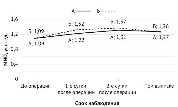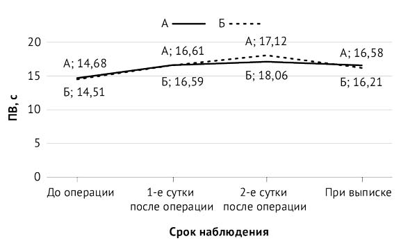 Мониторинг соответствующих показателей проводили до операции, на 1-е и 2-е сутки после операции и при выписке.
