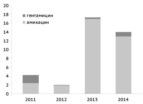 Рис. 1. Потребление антибактериальных средств системного действия группы аминогликозидов (J01G), установленная суточная доза/100 койко-дней, 2011–2014 гг.