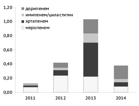 Несмотря на положительные моменты нашей программы мониторинга и обучения, появились новые проблемы в использовании антибиотиков, которые требуют внимания: повышение потребления карбапенемов в 3 раза — с 0,12 до 0,38 УСД/100 койко-дней. В 2013 г. был предельно высокий показатель потребления карбапенемов — 1,03 УСД/100 койко-дней, в первую очередь за счёт эртапенема (0,48 УСД/100 койко-дней). В 7 раз возросли затраты на закупку карбапенемов — с 6,75 до 47,42% общих затрат на все антибиотики. Потребление дорипенема возросло с 0,01 до 0,19 УСД/100 койко-дней, расходы на его закупку возросли с 1,18 до 31,57% затрат на все антибиотики! Потребление эртапенема возросло в 2 раза — с 0,03 до 0,06 УСД/100 койко-дней, расходы на его закупку возросли с 1,2 до 6,69% всех затрат на антибиотики. Потребление имипенема/циластатина возросло с 0,01 до 0,04 УСД/100 койко-дней, расходы на его закупку возросли с 0,87 до 5,4% всех затрат на антибиотики. Использование меропенема существенно не изменилось — потребление его в 2011 г. составило 0,07 УСД/100 койко-дней, в 2014 г. — 0,08 УСД/100 койко-дней, а затраты на его закупку составили 2,5 и 3,76% в 2011 и 2014 гг. соответственно (рис. 2).