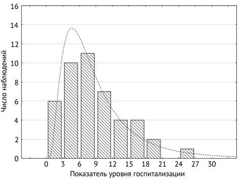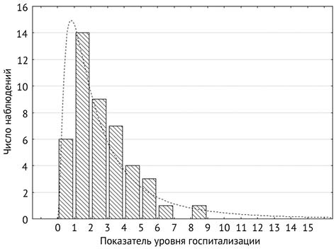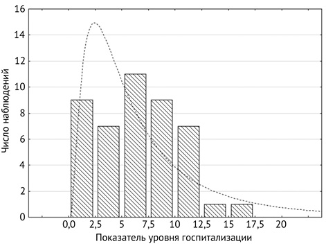 Гистограмма распределения показателя госпитализации по причине стабильной стенокардии и хронической ишемической болезни сердца представлена на рис. 3, показатели распределения отражены в табл. 3.
