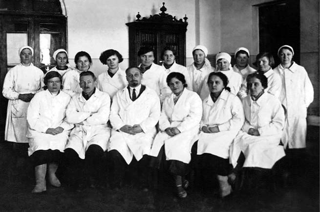 Рис. 3. Коллектив кафедры микробиологии (1940). Заведующий кафедрой профессор Р.Р. Гельтцер