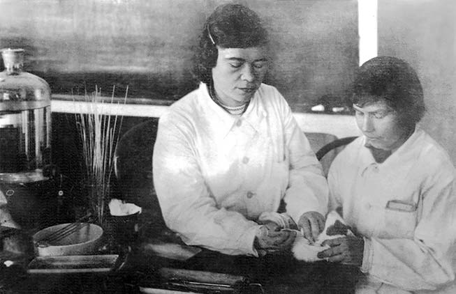 Рис. 5. Ассистент Е.К. Наумова (слева) и лаборант Н.В. Соколова за работой (40-е годы)