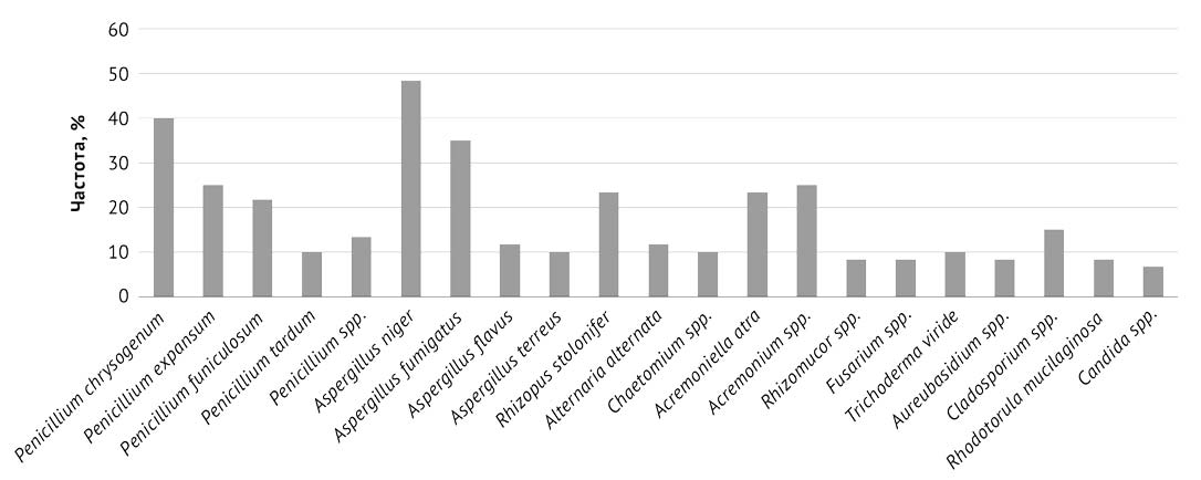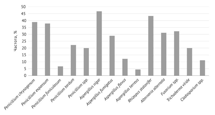 Рис. 2. Частота грибов-микромицетов в очагах биоповреждения в жилых помещениях г. Казани (% общего числа проб из очагов)