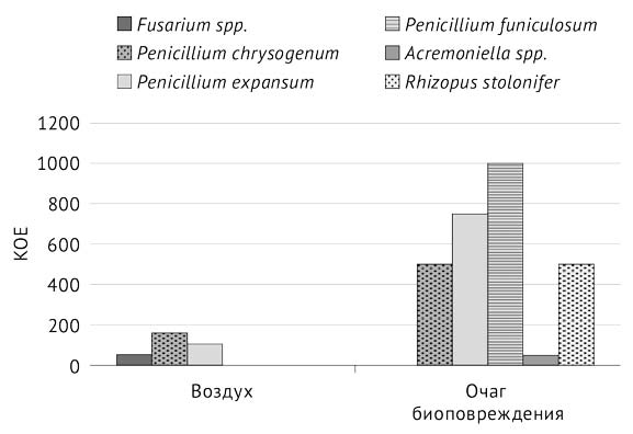 Рис. 3. Сопоставление качественного и количественного состава микобиоты воздуха (КОЕ/м3) и очага биоповреждения (КОЕ/дм2); КОЕ — колониеобразующие единицы