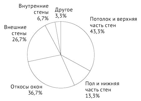 Рис. 4. Локализация очагов грибкового биоповреждения (% количества обследованных помещений)
