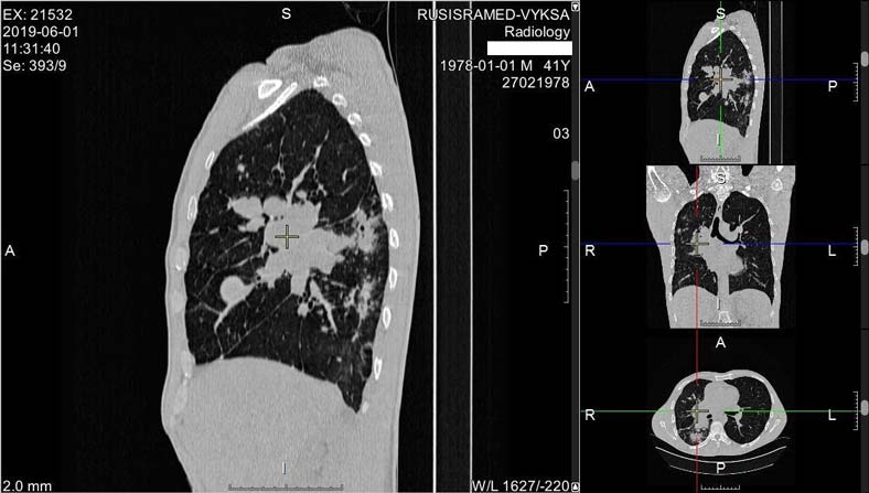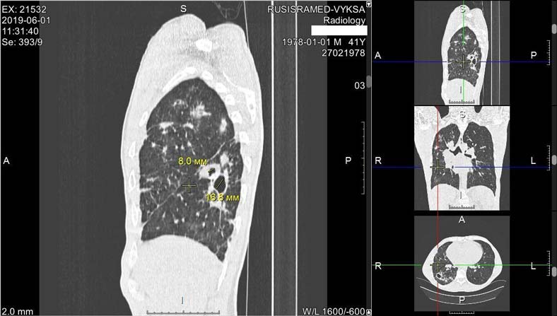 Рис. 1. Мультиспиральная компьютерная томограмма органов грудной клетки. Снимки пациента от 01.06.2019: деструкция лёгочной паренхимы в нижней доле правого лёгкого