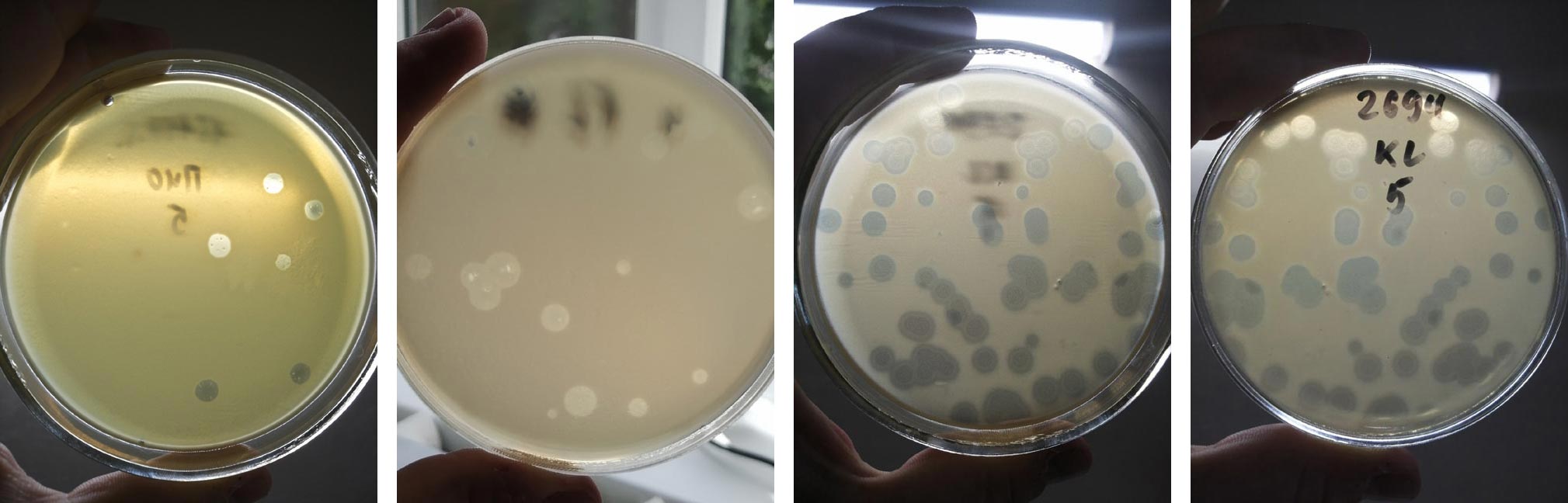 Для количественной оценки литической активности бактериофагов в отношении культур, к которым была выявлена умеренная чувствительность (++), использовали метод Грациа (n=8). Данный метод позволяет регистрировать количество негативных колоний (стерильных пятен), образовавшихся в агаризованной питательной среде в результате инкубирования взвеси бактериофага при его культивировании с тестируемыми изолятами. Учитывали результаты путём подсчёта БОЕ, засеянных наиболее высокими разведениями (рис. 1).