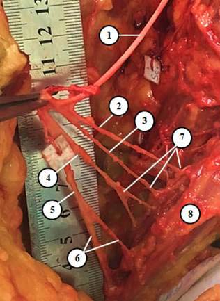 Рис. 1. Формирование вне- и внутримышечных ветвей грудоспинного нерва (вариант деления на четыре ветви): 1 — грудоспинной нерв; 2 — внемышечная (медиальная) ветвь грудоспинного нерва; 3 — внемышечная (центральная) ветвь; 4 — внемышечная (латеральная промежуточная) ветвь; 5 — внемышечная (латеральная) ветвь; 6 — (препарированные) внутримышечные ветви к наружному отделу широчайшей мышцы спины (ШМС); 7 — (препарированные) внутримышечные ветви к внутреннему отделу ШМС; 8 — ШМС