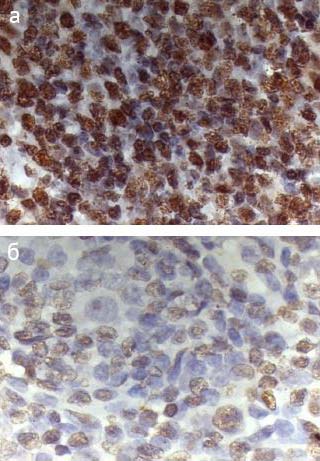 Рис. 1. Лимфатический узел. Иммуногистохимическая окраска опухолевых клеток антителом к pSTAT3: а — уровень ядерной экспрессии рSTAT3 ≥68%; б — уровень ядерной экспрессии рSTAT3 <68%, ×1000