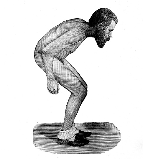 1-го октября 1899 года онъ снова явился въ клинику и сообщилъ, что ему одно время было лучше: онъ могъ свободнѣе ходить; а затѣмъ опять стало хуже, причемъ онъ жаловался на постоянныя боли въ поясницѣ при хожденіи и боли въ шеѣ при поворачиваніи ея,—на то, что его еще больше «скрючило»,—на усилившуюся боль въ пяткахъ и невозможность ходить безъ палки. При обслѣдованіи 1-го октября 1899 года найдено. Дугообразное кифотическое искривленіе позвоночника выражено еще рѣзче: оно начинается съ верхнегрудныхъ позвонковъ и простирается до верхнепоясничныхъ. Кромѣ того, замѣчено сколіотическое искривленіе, выпуклостью влѣво. При движеніяхъ туловища позвоночникъ абсолютно неподвиженъ въ грудной и поясничной частяхъ. Въ шейной части движеніе позвоночника хотя и есть, но ограничено. При поколачиваніи позвоночникъ безболѣзненъ, а равно и при форсированномъ надавливаніи на плечи. Суставы при ощупываніи безболѣзненны. Лѣвый колѣнный суставъ увеличенъ въ объемѣ. Это увеличеніе движенію ноги не препятствуетъ и не вызываетъ въ ней боли. Самостоятельныхъ болей въ суставѣ тоже нѣтъ. Въ области пятокъ и при давленіи ощущается сильная боль. Періоститовъ на костяхъ не имѣется. Движеніе шеи впередъ нормальны ио объему и силѣ. Активное и пассивное движеніе шеи назадъ, а также и поворотъ вокругъ вертикальной оси ограничены вслѣдствіе появляющейся въ позвонкахъ боли. Наклоненіе головы на бокъ вслѣдствіе тугоподвижности позвонковъ и боли въ никъ ограничено. Въ верхнихъ конечностяхъ движеніе активное и пассивное въ плечевомъ сочлененіи выше горизонта ограничено по объему и силѣ опять таки вслѣдствіе тугоподвижности и боли этого сустава. Въ остальныхъ суставахъ рукъ движеніе не разстроено. Сила правой руки=44 kil.; лѣв. —33 kil. Движенія туловища во всѣхъ направленіяхъ по объему ограничены: впередъ болгной можетъ немного согнуть туловище, но назадъ это движеніе совершенно невозможно; наклоненіе туловища на бокъ невозможно; движеніе туловища вокругъ вертикальной оси возможно только при участіи таза. Типъ дыханія брюшной; грудная клѣтка при дыханіи мало подвижна. Область живота представляется слегка выпяченной. На границѣ между нею и грудной клѣткою видна ясно выраженная поперечная складка. Брюшной прессъ напрягается съ нормальной силой. Во всѣхъ сочлененіяхъ лѣвой ноги объемъ движеній нормаленъ; сила слегка ослаблена. Движеніе активное и пассивное въ тазобедренномъ суставѣ правой ноги во всѣхъ направленіяхъ по объему нѣсколько ограничено вслѣдствіе тугоподвижности этого сустава. Движенія въ остальныхъ суставахъ ио объему нормальны, по силѣ ослаблены, причемъ это ослабленіе въ правой ногѣ выражено рѣзче. Лежать въ постели на спинѣ съ вытянутыми ногами больной не можетъ вслѣдствіе появляющейся у него болѣзненности въ тазобедренномъ сочлененіи и неподвижности позвоночника, а затѣмъ и вслѣдствіе появляющагося при этомъ чувства болѣзненнаго пояса въ поясницѣ. При такомъ положеніи больного между спиною въ верхнегрудной части и постелью остается совершенно свободное пространство, исчезающее при сгибаніи ногъ въ колѣнномъ и тазобедренномъ сочлененіяхъ. Послѣднимъ положеніемъ своего тѣла больной и пользуется всякій разъ, когда ложится въ постель, такъ какъ при этомъ исчезаетъ боль въ тазобедренномъ суставѣ и позвоночникѣ. Координація движен
