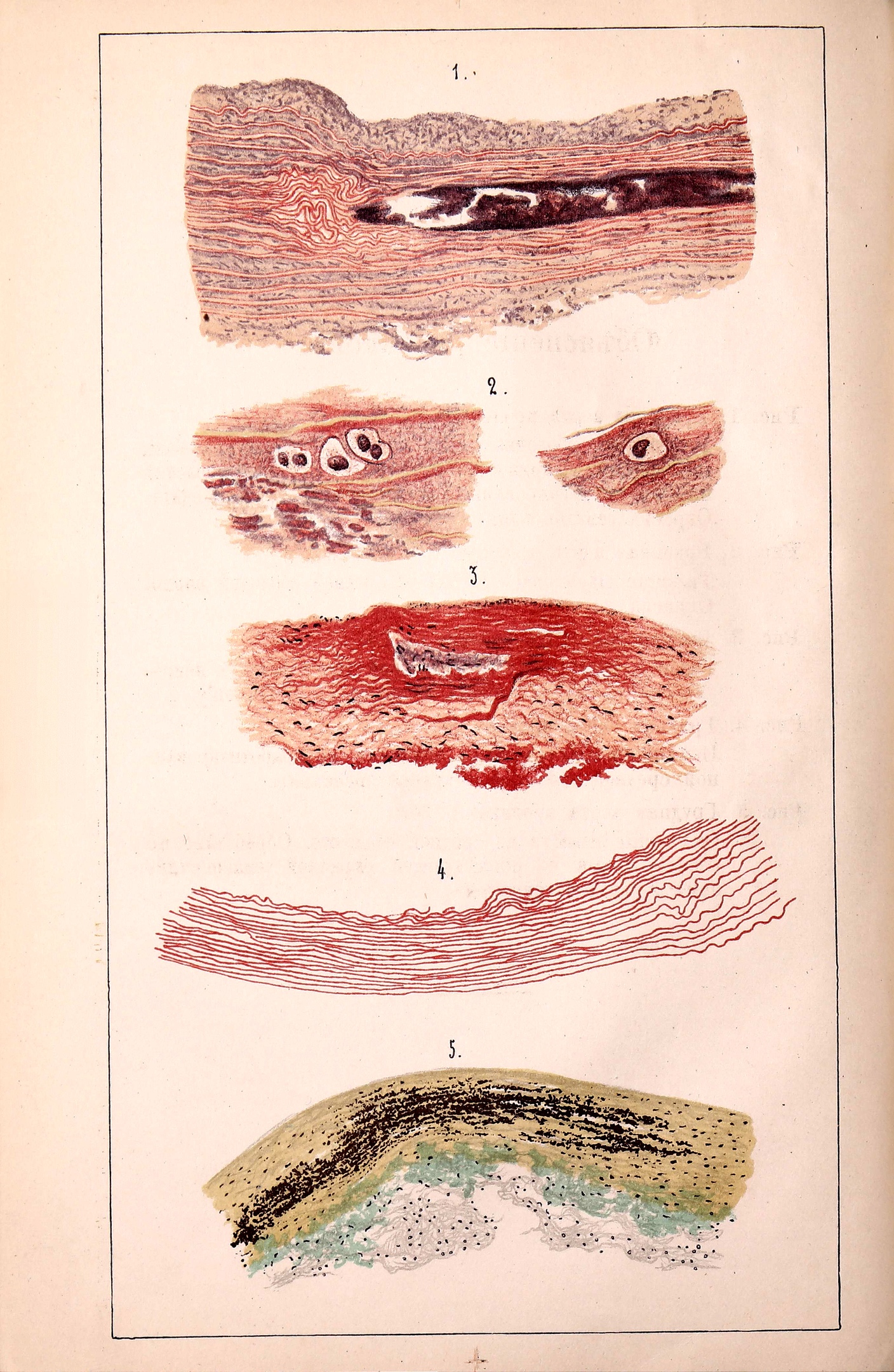 Что касается микроскопическихъ измѣненій въ аортѣ, то онѣ выражаются главнымъ образомъ въ пораженіи средней оболочки сосуда и состоятъ въ развитіи здѣсь некроза мышечныхъ эле­ментовъ съ послѣдующимъ ихъ объизвествленіемъ. Большинство авторовъ считаетъ, что процессъ начинается съ пораженія глад­кихъ мышцъ mediae, и только нѣкоторые изслѣдователи (Scheide­mandel, Весельковъ) утверждаютъ, что самыя раннія измѣненія начинаются въ эластическихъ волокнахъ, мышцы же поражаются вторично. Вокругъ некротическихъ очаговъ часто происходятъ ре­активныя явленія со стороны окружающихъ тканей; реакцію эту одни авторы (Ziegler, Тороповъ) склонны считать за воспалитель­ную, другіе же (Scheidemandel, Pearce and Stanton, Lissauer) воспалительный характеръ ея отрицаютъ; многими описано при­сутствіе вблизи известковыхъ бляшекъ гигантскихъ клѣтокъ (Zieg­ler, Широкогоровъ, Scheidemandel). Некротическіе очаги въ сред­ней оболочкѣ аорты могутъ замѣститься вновь развившейся здѣсь рубцовой соединительной тканью; иногда же въ стѣнкѣ сосуда наблюдается образованіе хрящевой (Трахтенбергъ, Орловскій, Міёsowicz) и даже настоящей костной ткани (Весельковъ).
