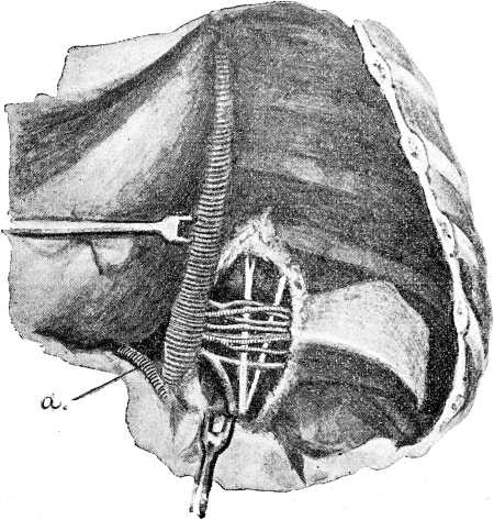 Тоже, но только распрепарованъ hilus прибавочнаго легкаго и видѣнъ также аномальный сосудъ а, идущій въ задній край лѣваго легкаго. Прибавочный органъ смѣщенъ влѣво.