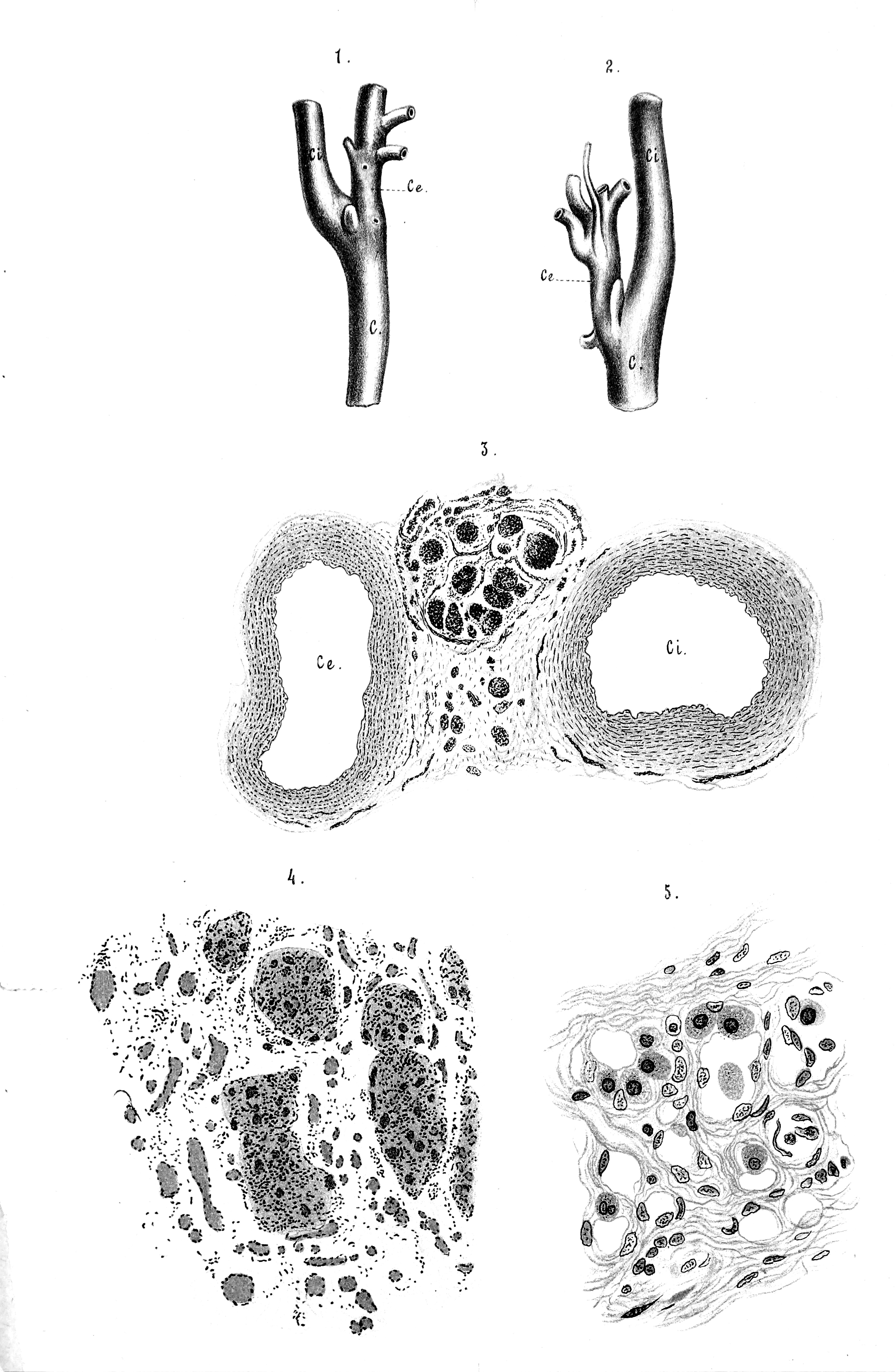 Arnold 2) въ 1865 году, изслѣдуя сонную железу, пришелъ къ заключенію, что это образованіе есть ни что иное, какъ сосудъ, стѣнка котораго на опредѣленномъ мѣстѣ сильно разрослась и образована многослойнымъ эпителіемъ, почему онъ и рекомендовалъ назвать его подъ общимъ именемъ —„Glomeruli arteriosi inter- carotici", такъ какъ здѣсь налицо имѣется нѣсколько клѣточныхъ кучекъ, связанныхъ между собою соединительной тканью.