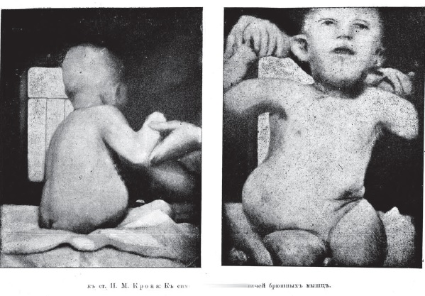 The literature on paralysis of the abdominal muscles with polyomyelitis is still very poor. In Russian literature, as far as I know, there is no description of such a case. The picture of the disease can lead to erroneous diagnosis and pointless surgical intervention. In 1861, Duchenne, in his classic work on the physiology of movements, already described the symptom complex of paralysis of the abdominal muscles in the case of generalized paralysis in 5 years. child.