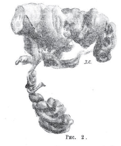Удаленная правая труба (см. рис. 1) по своему наружному виду имѣла форму колокола, причемъ на свободномъ широкомъ копцѣ ея помѣщалось плодовмѣстилище съ хорошо сформированной плацентой.