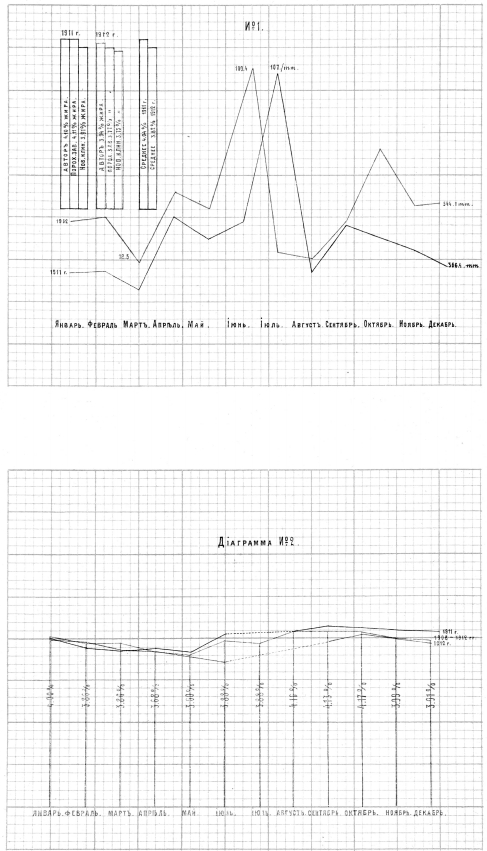 Это можетъ служить подтвержденіемъ уже ранѣе высказаннаго мною предположенія, когда сравнивались годовыя среднія Новыхъ Клиникъ. (Смотр. стран. 10). И дѣйствительно, если мы обратимъ вниманіе на діаграмму № 1, гдѣ мной представлены кривыя осадковъ этихъ лѣтъ, то будетъ вполнѣ ясно, что 1912 г. былъ значительно дождливѣе 1911 г., почему можно предположить, что это и отразилось на количествѣ жира въ молокѣ.