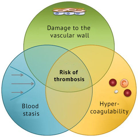 The pathogenetic triad that underlies thrombosis includes blood composition changes due to hypercoagulability, vascular wall damage, and slowing of blood flow (*****Fig. 1). This classical concept, known as Virchow’s triad [6], has retained its significance to the present day, albeit with significant additions [7]. Contemporary concepts indicate that vascular wall damage plays a critical role in thrombosis. Slowing of blood flow is crucial for venous thrombosis, whereas arterial thrombosis is associated with high blood flow velocity [8].