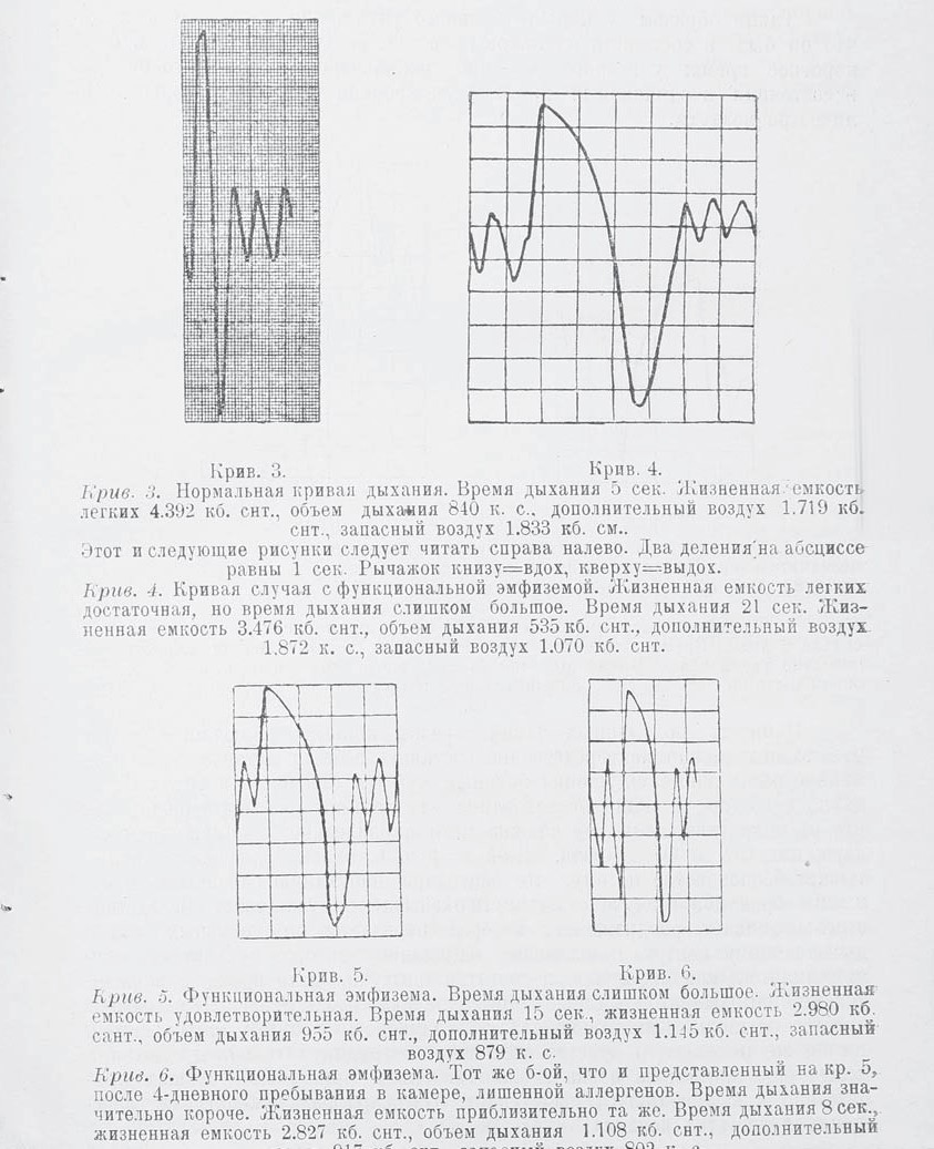 Нижеизложенное разъясняет некоторые полученные таким путем кривые. Крив. 3 представляет нормальную кривую дыхания. Крив. 4 представляет кривую больного с функциональной эмфиземой, снятую на второй день после поступления больного в клинику. Отчетливо видно, что отклонение от нормы заключается не в том, что дыхательные движения слишком малы, а в том, что для вдоха и в первую очередь для выдоха требуется гораздо больше времени.