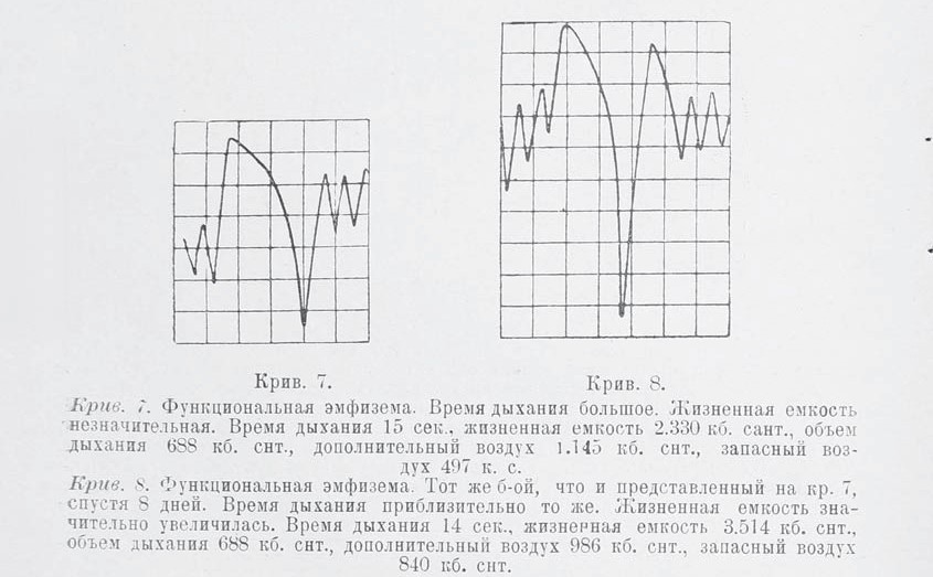 Крив. 7. Функциональная эмфизема. Время дыхания большое. Жизненная емкость незначительная. Время дыхания 15 сек., жизненная емкость 2.330 кб. сайт., объем дыхания 688 кб. снт., дополнительный воздух 1.145 кб. снт., запасный воздух 497 к. с.